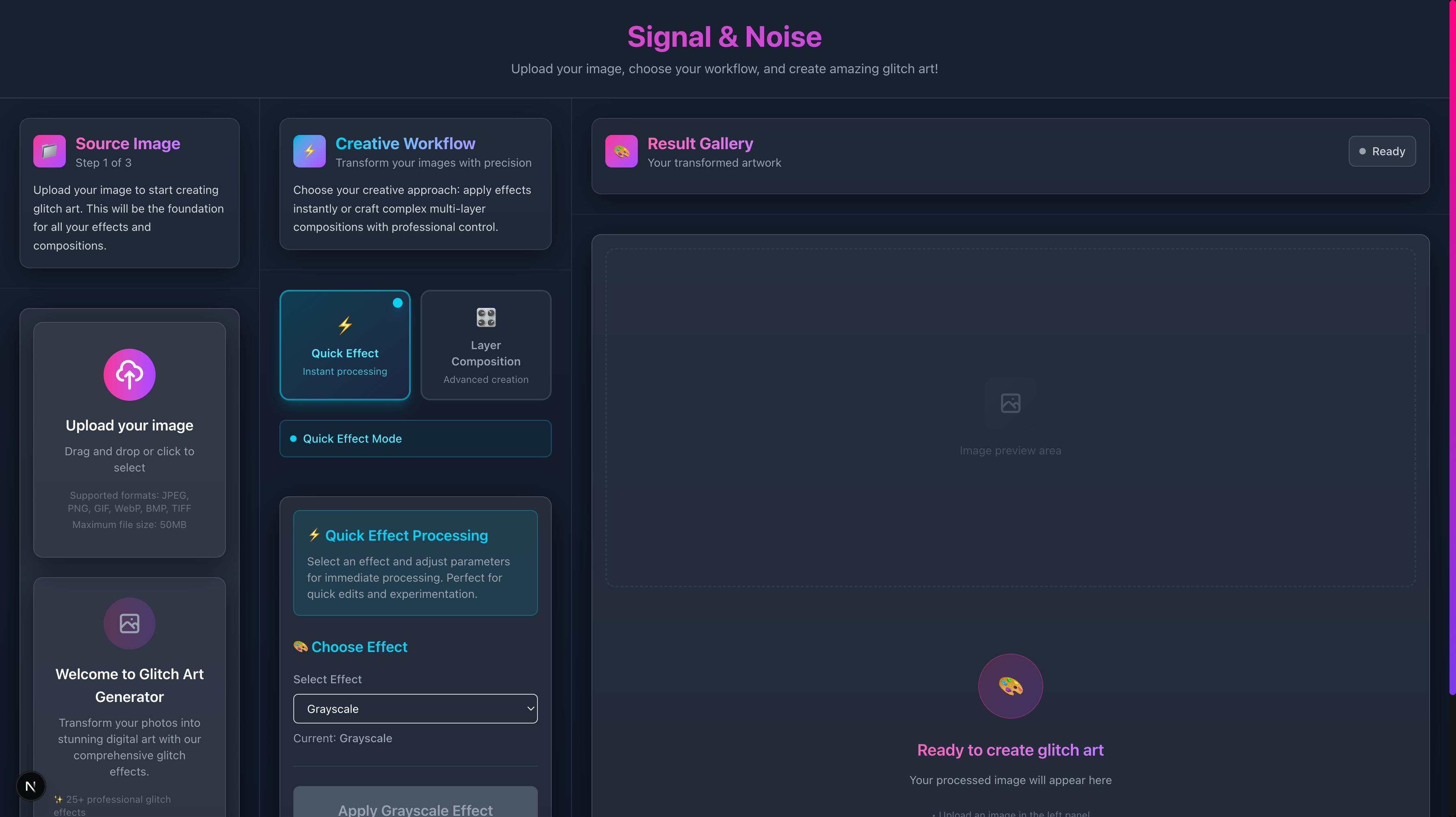 A comprehensive image processing tool for creating glitch art effects with advanced layer composition capabilities. Name iterated on from the original idea - Photoslop. Features 34+ effects across 9 categories, professional layer system with 18 blend modes, and glassmorphism UI.